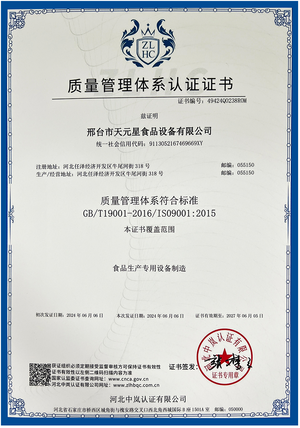 公司榮譽(yù)證書(shū)_企業(yè)榮譽(yù)_ 邢臺(tái)市天元星食品設(shè)備有限公司二維碼